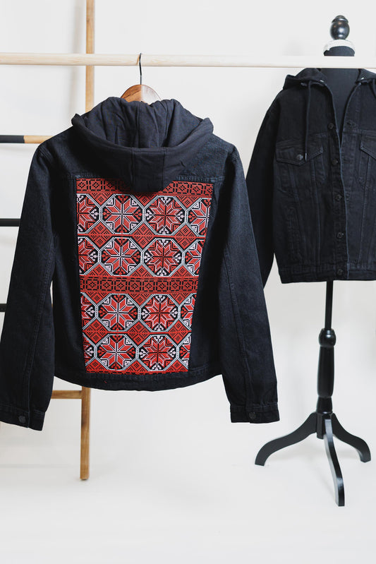 Tatreez Embroidered Black Denim Hooded Jacket | Unisex Streetwear