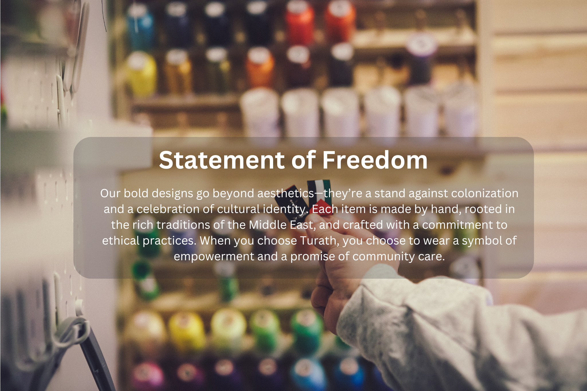 I am a huge fan of Turath! It is our go to spot for new accessories or gidts for families and friends! The artists are so thoughtful and talented! Their works speaks for itself but what not everyone knows is that they are extremely generous -- offering so much in donations to Palestine solidarity groups -- and so generously willing to make things work for the customer!