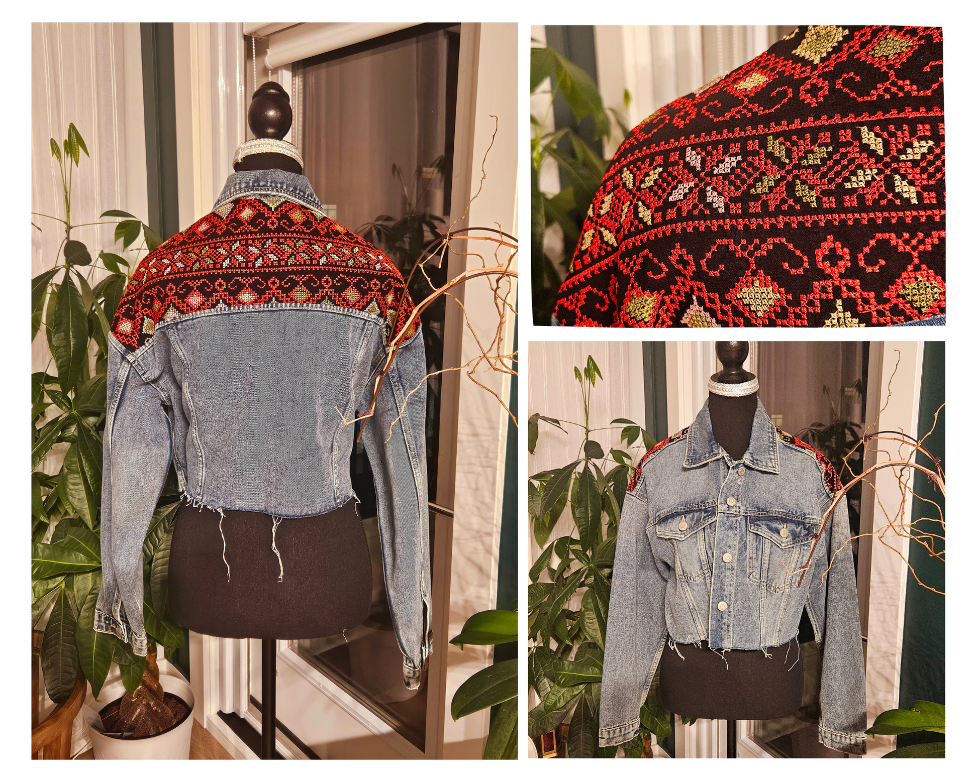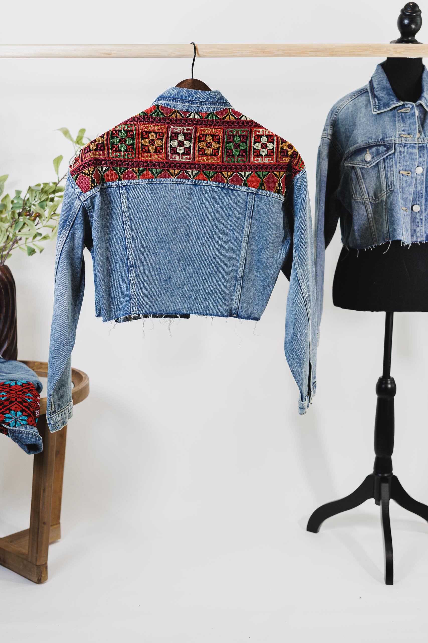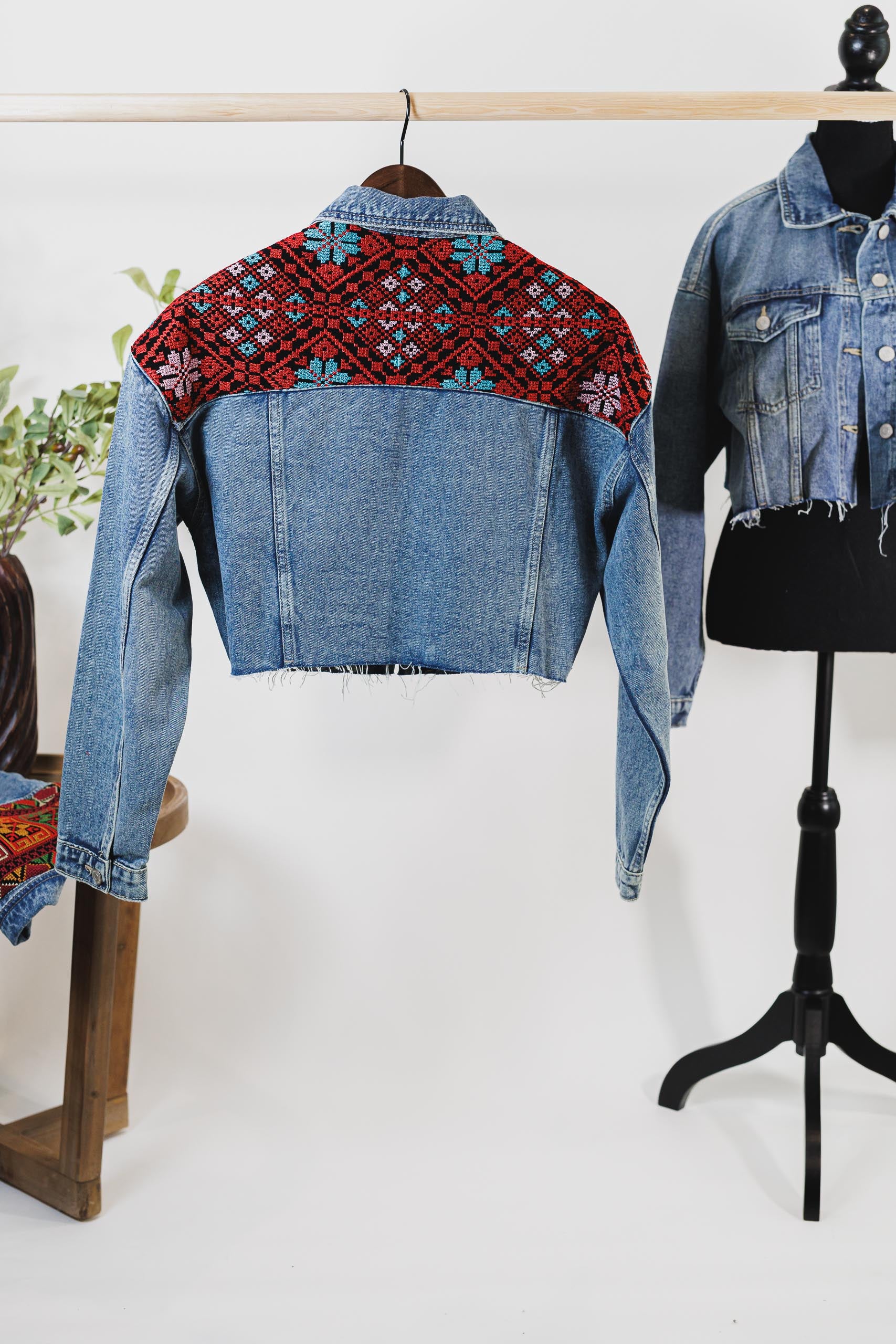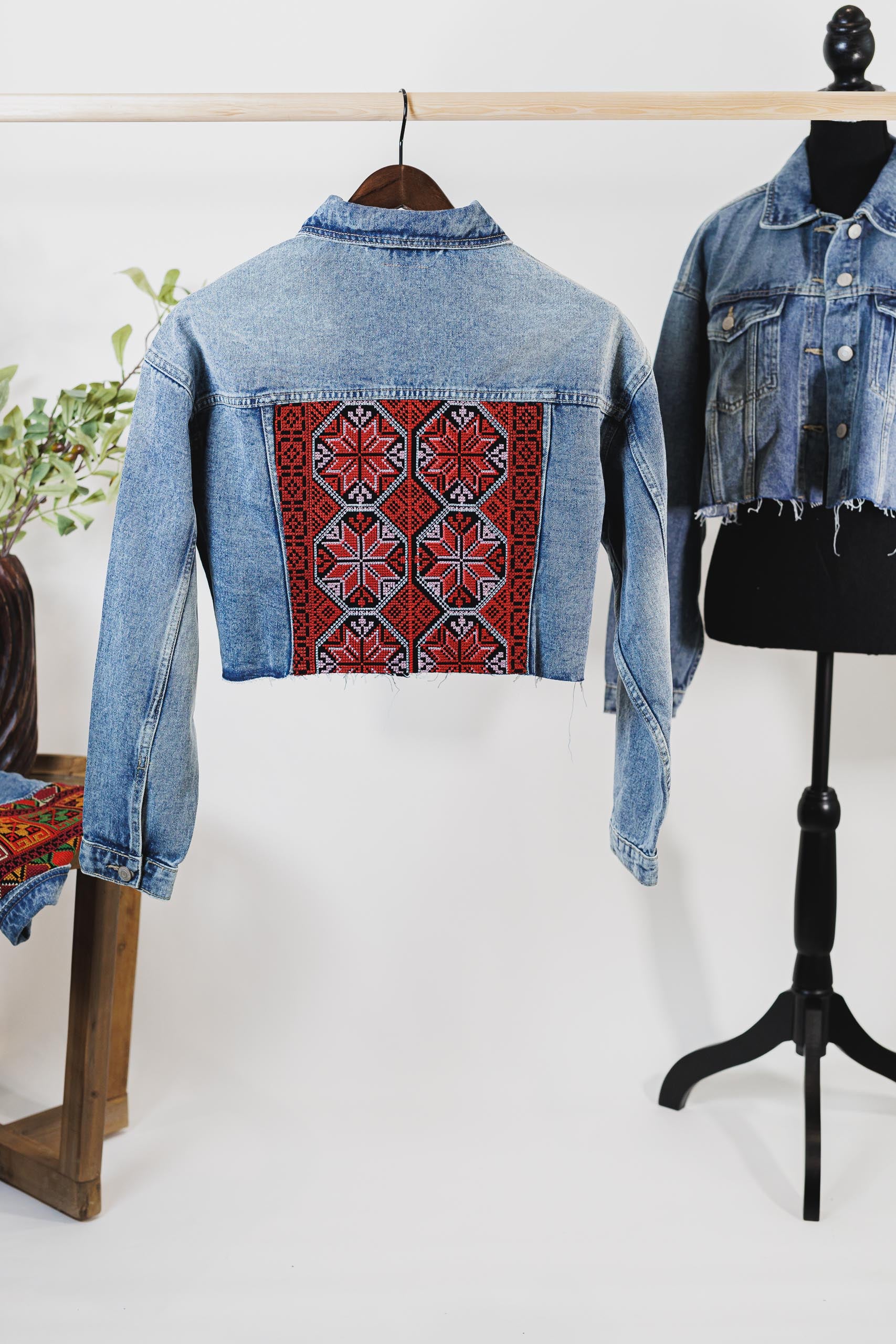 This dark blue cropped denim jacket blends contemporary style with cultural legacy. Designed with a relaxed, oversized fit for effortless layering, each piece is adorned with machine-stitched Palestinian Tatreez embroidery—either on the shoulders or boldly across the back.