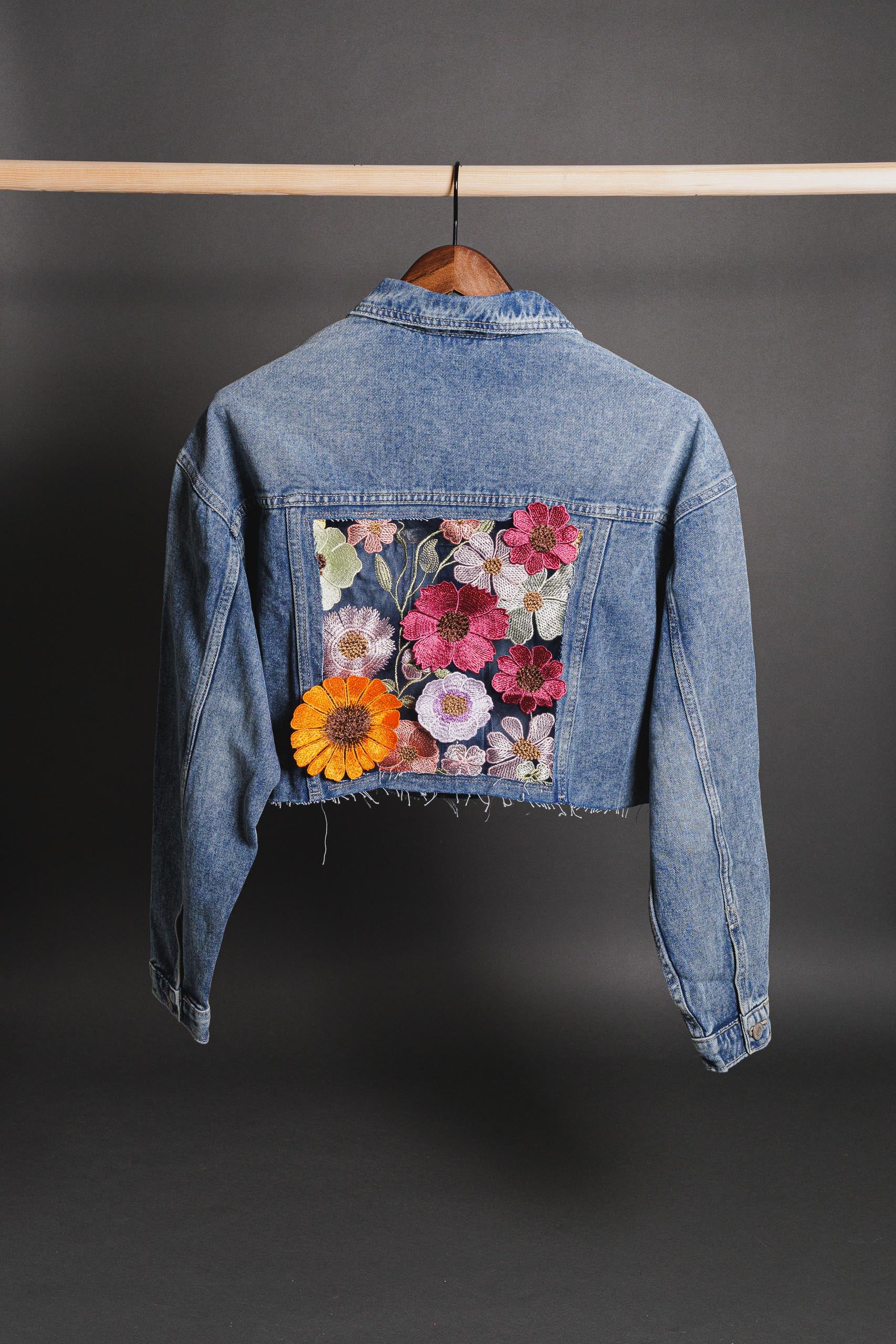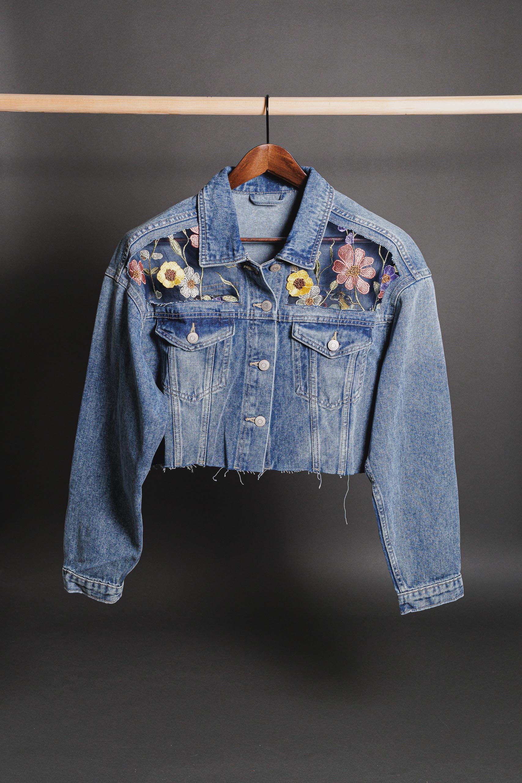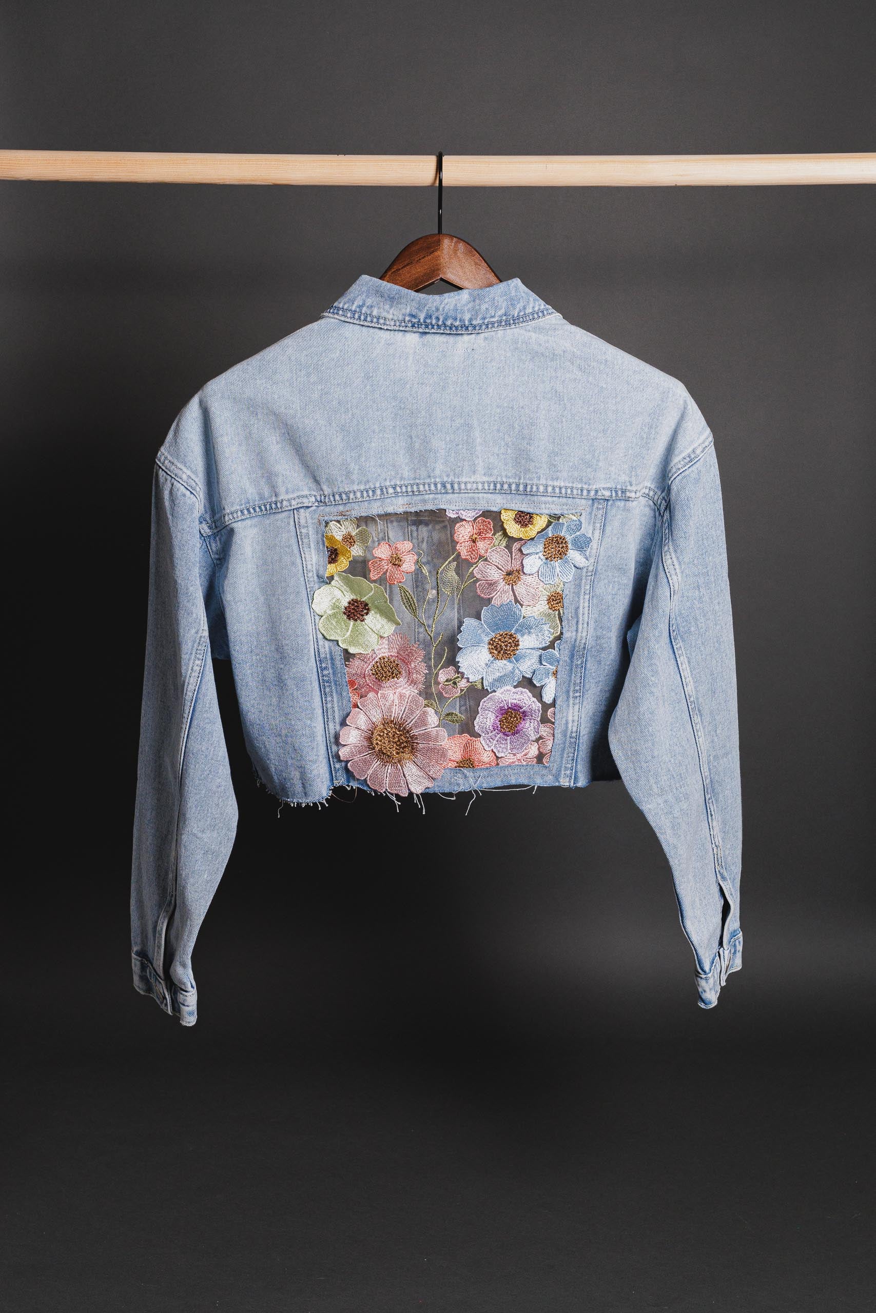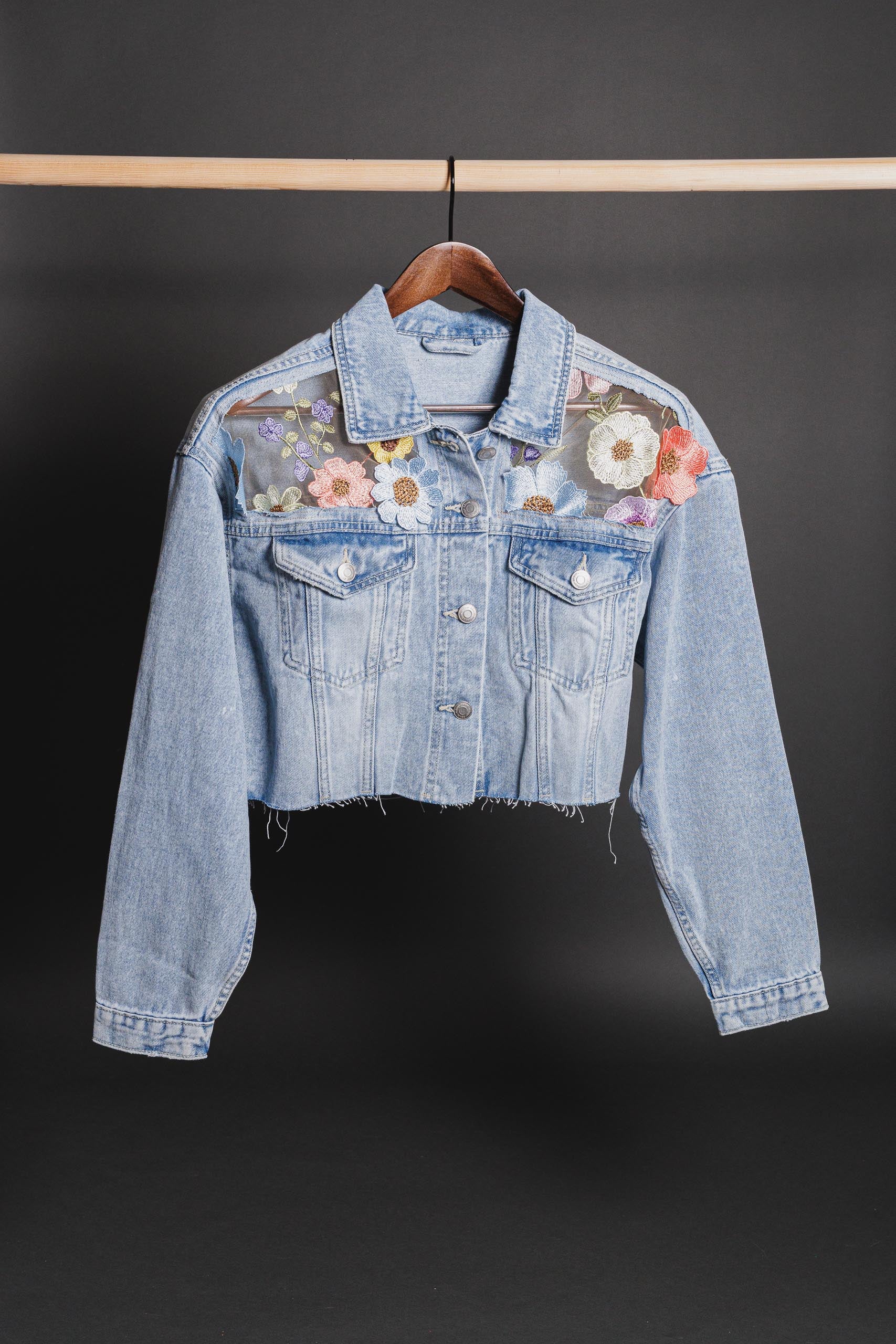 The Floral Breeze Denim Jacket features delicate sheer floral fabric in place of denim across the entire back and the front shoulder panels, creating a dreamy, airy silhouette that moves with the wind. The raised embroidered flowers add texture, dimension, and softness, giving this piece an ethereal, statement-making edge.