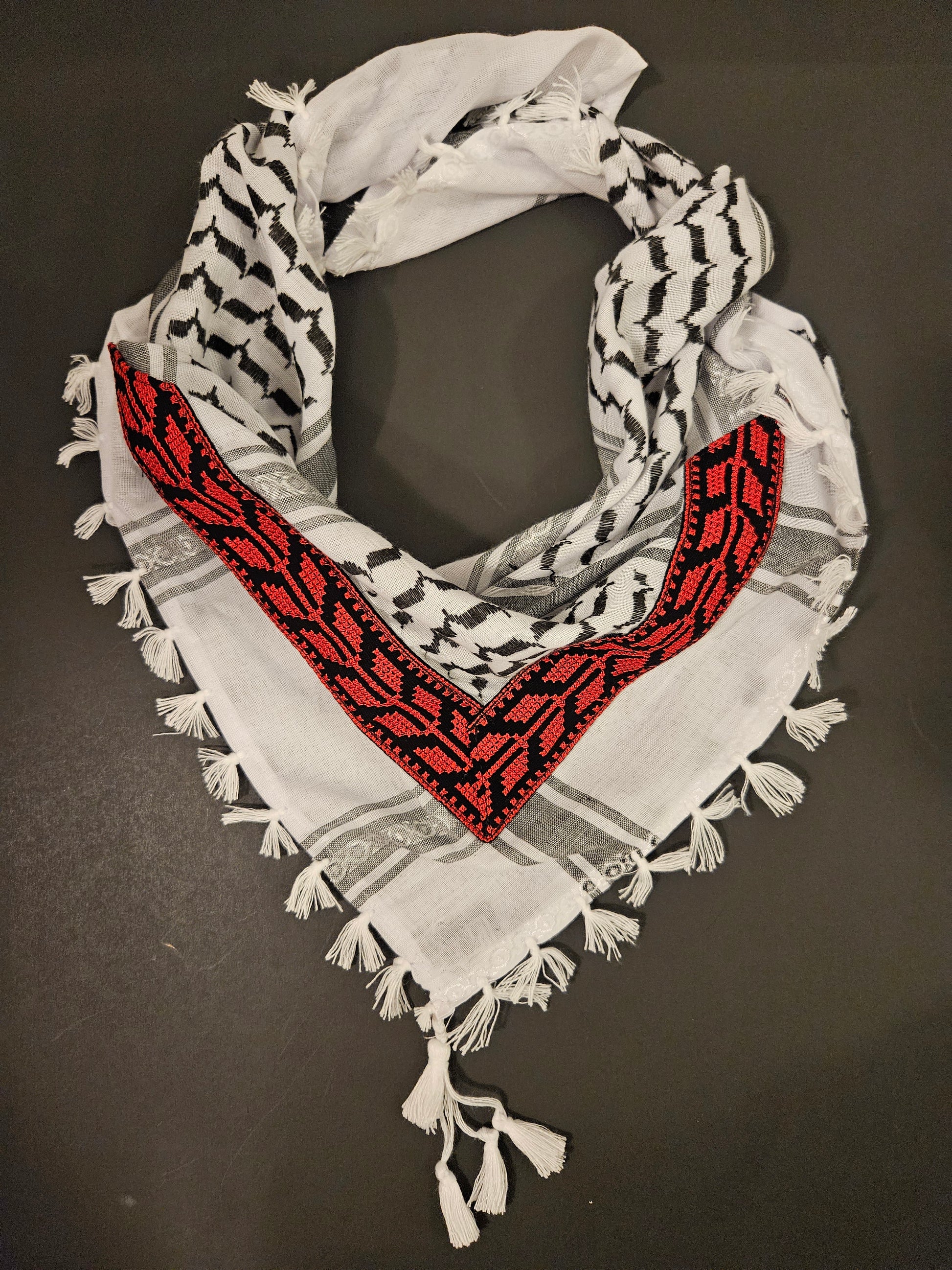🌍 Wear it as a bandana, headscarf, or neck accessory — the keffiyeh’s black-and-white patterns symbolize resilience, while the added Tatreez motifs honor ancestral artistry passed down through generations.
